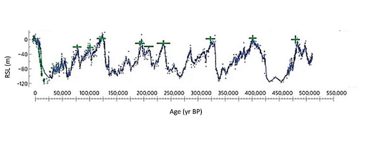 The first key question is “where did so much water come from?” Intuitively, one looks at the oceans, the most significant source of water. The total amount of water in oceans and seas shares a dynamic relationship with ice sheets. That is, more solid landlocked ice translates to less liquid water in oceans and seas, and vice versa. This feature means the ice mass fluctuates over time through ice melt. The main driver of ice sheet melt is solar insolation (exposure to sunlight), which on long timescales is influenced largely by the behavior of Earth’s orbit and rotation, which in turn drives the melting and freezing of water on Earth. The dominant sea-level signal over the last 800,000 years is the 100,000-year ice cycle (figure 1). The cycle shows that sea-level change during glacial (ice age) and interglacial cycles reached ranges of up to 120 meters in elevation 2 (indicated as relative sea level [RSL], the height of the ocean or sea relative to land at a particular location).